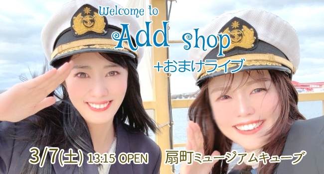 【会場観覧】 [チケット販売] [予約/取り置き] [空席/増席(枠)待ち申し込み] 【配信視聴】 [配信/録画(アーカイヴ)チケット販売] [購入済みチケットのキャンセル/払い戻しについて] [会場チケット購入済みで会場に来れなかった場合] ◆ 3/7(土) 扇町ミュージアムキューブ [大阪] [物販+おまけライブイベント] 西村加奈と前田有加里「Addショップ+おまけライブ」 13:15〜 入場無料 / 2F CUBE04 13:15〜15:45 Addショップ ※最終入店時間は15:15 16:00〜16:30 おまけライブ [おまけライブについて] ・13:15〜15:45のAddショップ物販で2人の商品を購入で無料観覧券をお渡しします。 ※Addショップ最終入店時間は15:15 ※15:15以降は受付でAddポストカード2セット購入でも無料観覧券をお渡しします。 ※観覧希望の方は15:55には会場へお戻りください。 ※終演後の物販はありません。 ※観覧人数によっては立ち見になります。 【会場情報】 [住所] 大阪市北区北区南扇町6-26 [地図] https://maps.app.goo.gl/smtCRmD94dr6Jnvz8 [電車] 大阪メトロ堺筋線「扇町」駅 5号出口 徒歩3分 [電車] JR環状線「天満」駅 徒歩8分 [電車] JR「大阪」駅 徒歩15分 [バス] 大阪シティバス 37・83、または78系統「扇町」駅 下車 徒歩3分 [バリアフリー関連] 店舗はビル2階でエレベータ有り